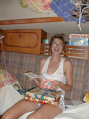 | Nicky's parents had left us with a locker-full of Christmas presents which we opened on Christmas morning, in mid-ocean. |