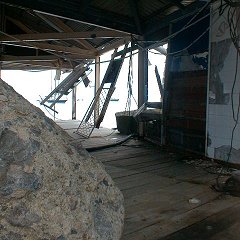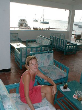 | Dominica's Anchorage Hotel provides a superb welcome and facilities for the visiting yachtsman at very reasonable prices. Beyond Nicky lies Rusalka Mist and, unknown to us at the time, just to her right and slightly nearer is Plénitude. This is the yacht of our good friend the excellent French single-hander Gerald, not seen since Tenerife. Shhh, that's him just climbing up onto the dinghy dock now... | ![]() |